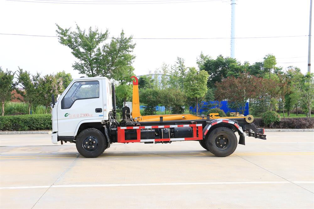 該款鉤臂式垃圾車由液壓系統、操作系統組成。舉升油制缸(1支)系國內知名液壓件廠家生產的雙作用油缸。垃圾廂可自吊上放下,可自行傾倒垃圾,上下一次工作循環時間≤50S。該車的特點是一個車能配多個垃圾廂,能實現一臺車與多個垃圾廂聯合作業,循環運輸,充分提高了車輛的運輸能力。