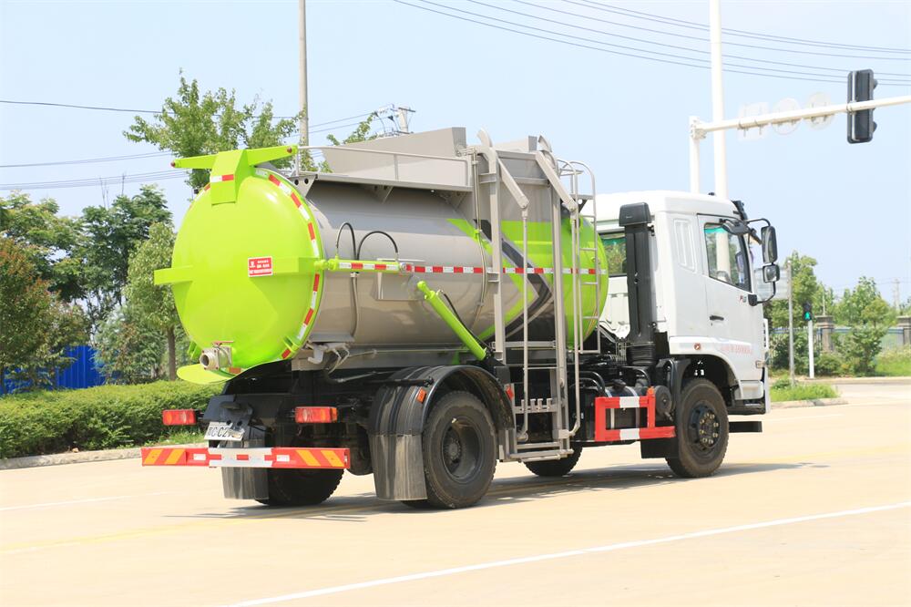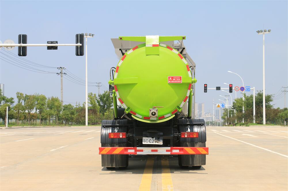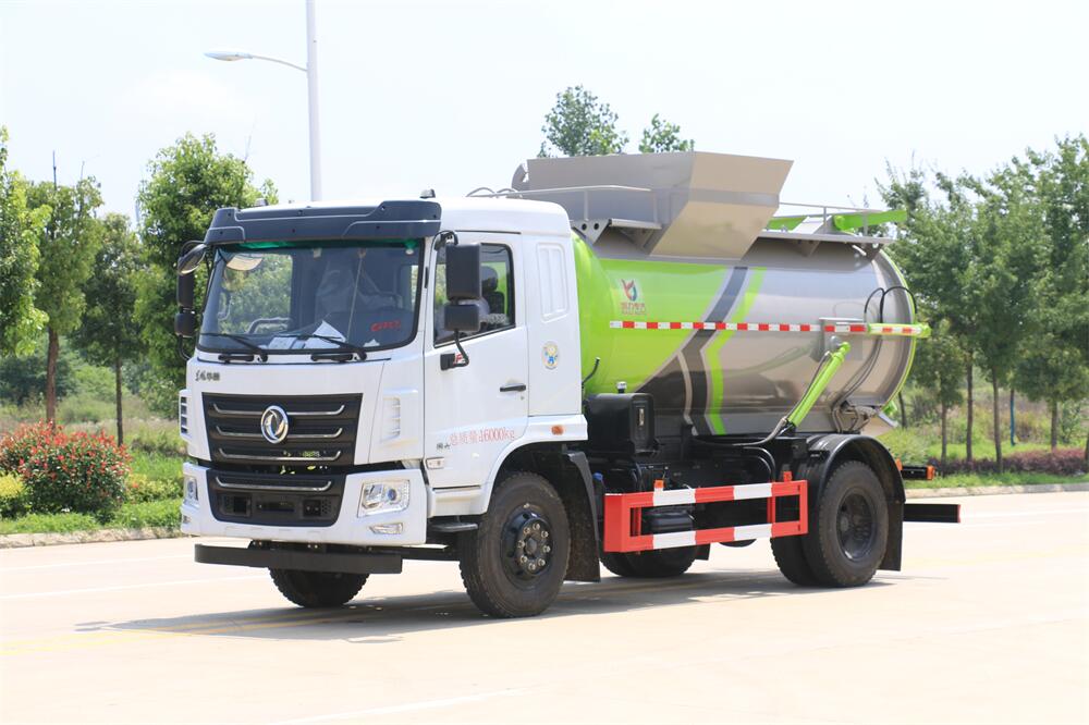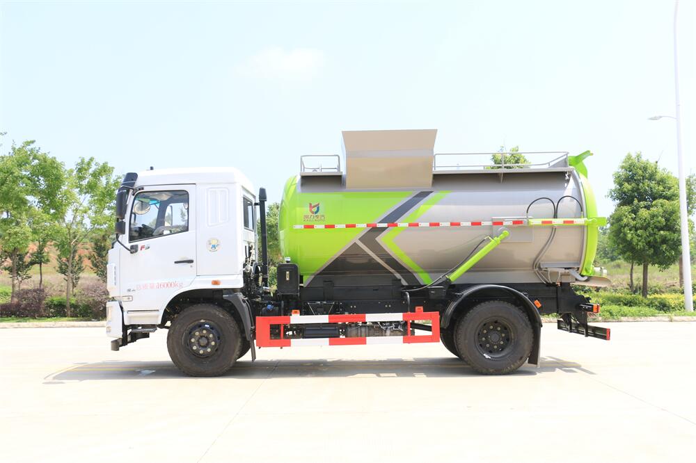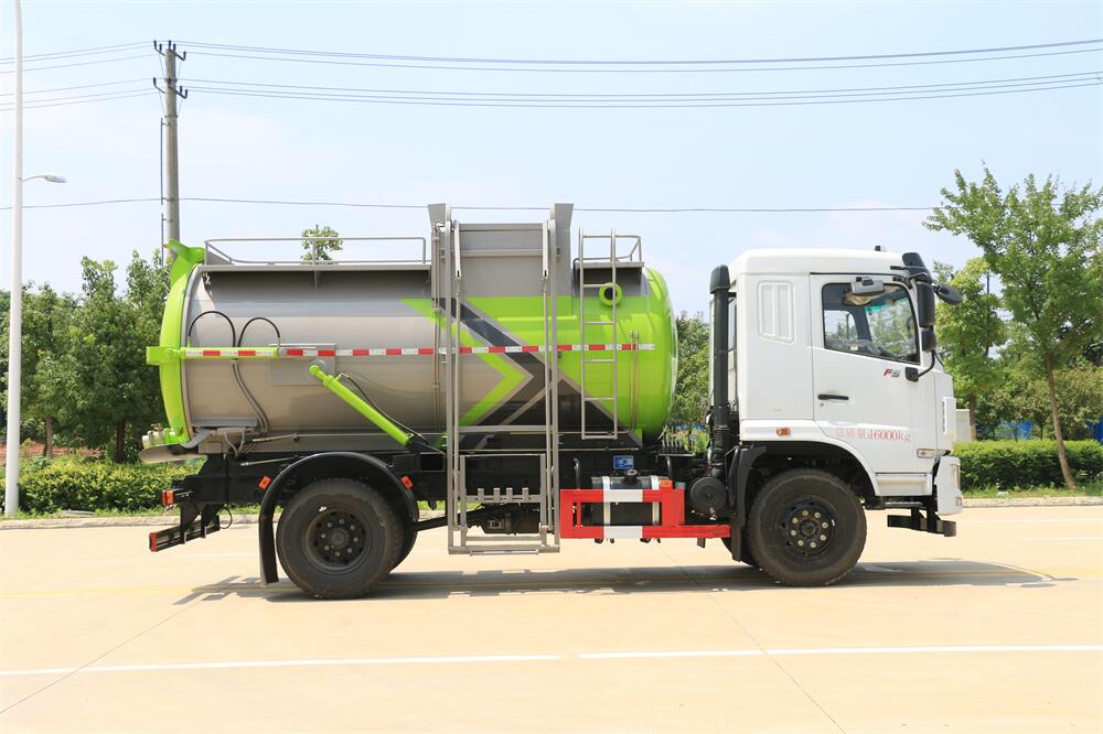 上裝配置:罐體容積10m3,配備120L/240L掛桶提升翻轉機構,液壓系統,后蓋液壓鎖緊開啟,罐體可以舉升自卸,尾部帶自流閥;用于運輸液態垃圾,其特點操作簡單,密封性好,無泄漏,無異味;可選裝固液分離功能,推板擠壓功能,常用于餐館的垃圾轉運處理。