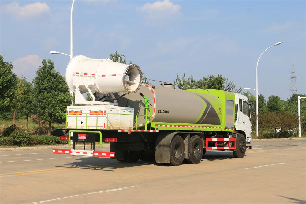 上裝配置:罐體容積為 16立方,選配風送式霧炮機組射程30米、40米、50米、60米、80米、100米、120米霧炮,罐體鋼板為4mm碳鋼Q235材質,罐內隔板具有防波作用,以減輕汽車行駛時罐體液體沖擊,罐體及整車外形尺寸按照公告。帶大功率專用灑水泵,泵可自吸自排,整車前沖、后灑、側噴、帶65消防接口,后平臺配CLW-50、CLW-60、CLW-80、CLW-100、CLW-120型風送式霧炮機組;罐體前封頭配大功率柴油發電機組;前封頭帶水位計,后平臺主管路帶1寸澆花接口,后爬梯。帶兩根輸水管及陰陽端。罐體顏色:銀/灰/綠,罐體兩側噴“多功能抑塵車”字樣,貼反光標示。