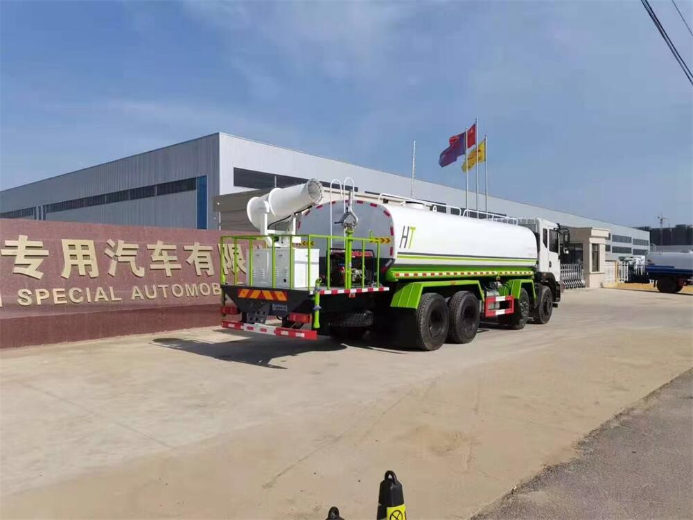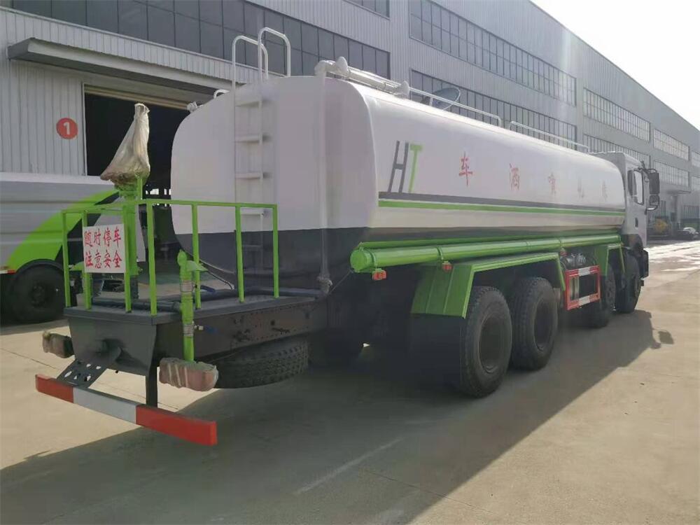灑水車前裝有鴨形噴嘴或圓頭沖嘴,后面裝有圓柱開(kāi)灑水噴嘴或蓮蓬頭噴嘴,后部有一工作平臺(tái),裝配有水炮。后部還可裝8個(gè)噴嘴(選裝)。