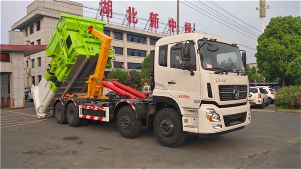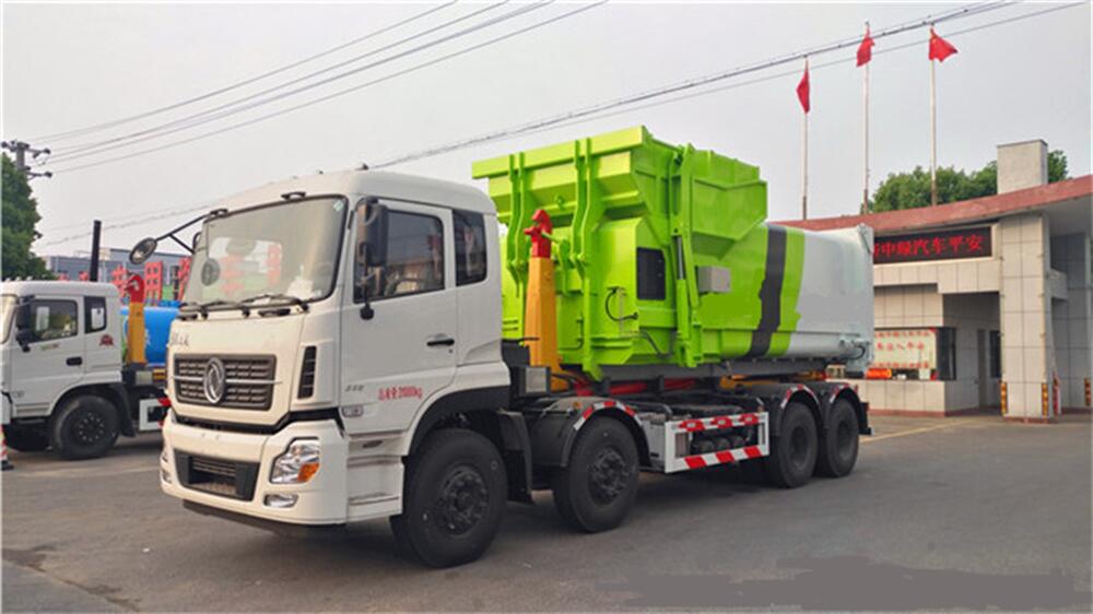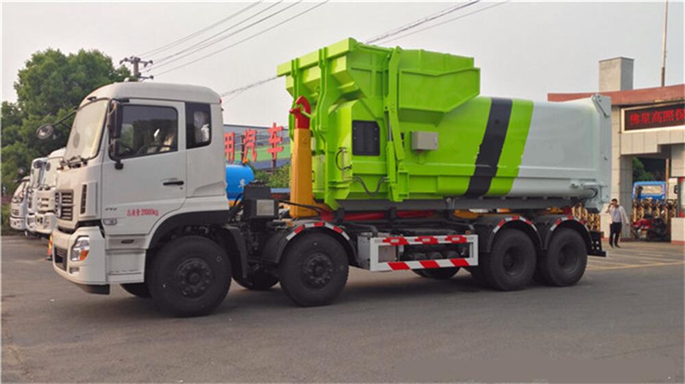 5、將汽車底盤倒進車位,鉤起機箱,將垃圾運往垃圾處理場。